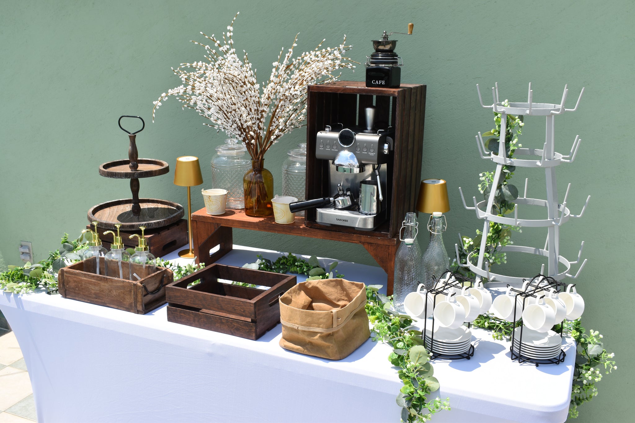 Alquila con nosotros el equipo necesario para establecer una elegante estación de servicio donde tus invitados disfrutarán de café, chocolate caliente, té, bocadillos, pan dulce o galletas.
